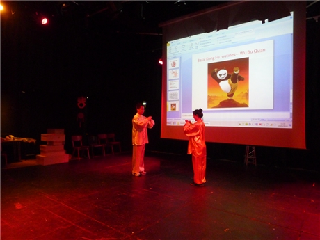 随后,赵雅妮老师教学生们唱起了“新年快乐”歌曲,穿插着各个班的比赛,同学们学得很卖力。最后的高潮要数功夫表演环节了,洪亮和赵梦婕向学生们演示了中国功夫中的基本拳法——五步拳,并邀请几名学生上台一起学习。学生们都踊跃参加,并且得到了印有功夫熊猫图案的体恤衫,学生们高兴地立马就穿在了身上。