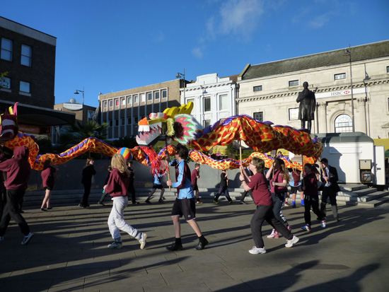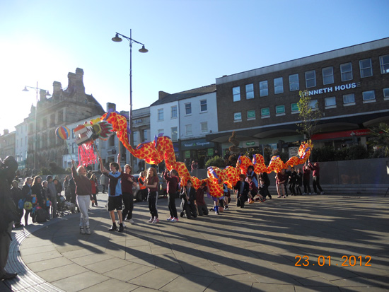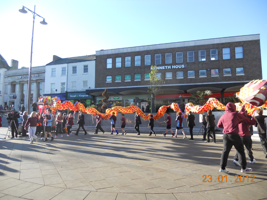 1月23日下午,艳阳高照,灯笼高挂,达灵顿Joseph Peace广场上人声鼎沸,站满了前来观看舞龙舞狮表演的市民。庆典开始前,Hummersknott Academy孔子课堂的负责人及汉语老师黄精丽向大家介绍了春节:“2012年是龙年。在中国神话里,龙是力量和好运的象征。祝愿大家2012年好运连连!”接着,学生们以热情洋溢的舞龙舞狮表演,引来了观众们连绵不断的掌声和夸赞。表演结束后,学生们还用流利的汉语及爽朗的笑声向大家送去了诚挚的龙年祝福。