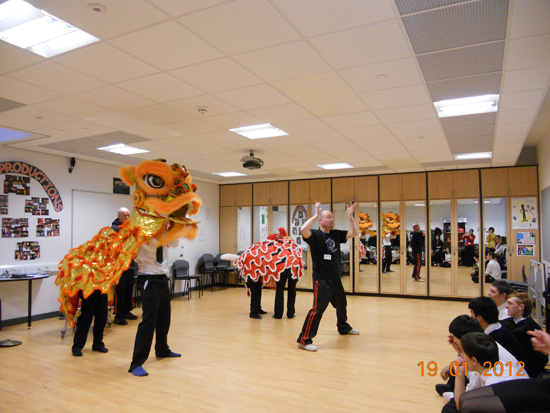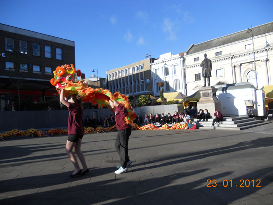 龙是中华民族的象征,是中华民族的吉祥之物,又是中华民族最重要的文化符号。2012恰逢龙年,舞龙活动成为不可或缺的新年庆典活动之一。为庆祝龙年春节的到来,来自英格兰学校联合会孔子学院Hummersknott Academy孔子课堂和Carmel College孔子课堂的学生,在当地时间1月23日、农历大年初一,于所在地区的中心地段Joseph Peace广场为市民们带来了精彩绝伦的舞龙、舞狮表演,吸引了众多当地市民驻足观赏。