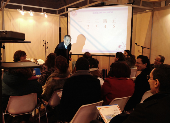 2月3日下午,巴黎七大孔子学院院长钱治安教授为各国汉语爱好者讲授汉语启蒙示范课。钱治安教授精通法语,用中法双语进行教学,以图文并茂的多媒体手段,结合中国古诗词及法语语言文化特点,教授最简单的汉语数字及基础汉字,深入浅出,寓教于乐,大家立刻对汉语学习以及汉语文化产生浓厚的兴趣。课堂上互动热烈,听众们认真做笔记,大家表示非常喜欢钱治安教授今天的课程,觉得非常受用,短短一堂课就让许多没有汉语基础的听众会说会认一些简单的汉字,有的汉语爱好者现场就咨询报名参加巴黎七大孔子学院的汉语课程。