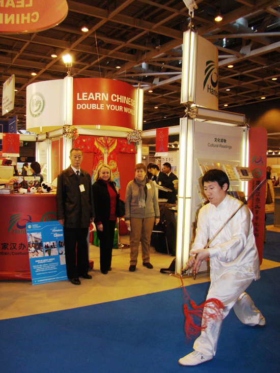 2月2日上午的太极课教师张振奇表演中国传统武术。张老师的一套拳打得虎虎生风,之后的剑术表演姿态潇洒英武,形式绚丽多彩,观众们纷纷拿出相机争先恐后的拍照,阵阵喝彩掌声,使老外们为中国武术所折服,让现场充满浓浓中国传统文化气息。