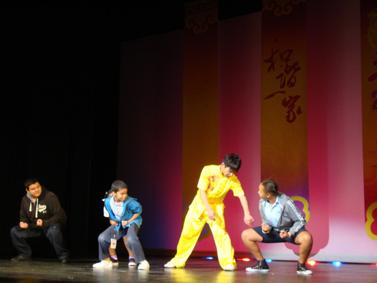 中国武术表演让有着英雄崇拜情结美国学生兴奋不已,武术表演者每完成一个动作,都会赢得一阵掌声和欢呼。随后,美国学生还被邀请上台,由武术表演者手把手地教授一段武术动作,这些自告奋勇上台的美国学生虽然动作稚拙生硬,引得台下一片哄笑,但态度十分认真,看得出来他们确实渴望了解和掌握中国武术。