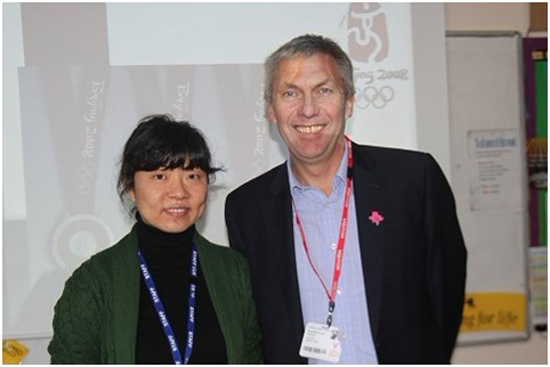 杜晓劼老师带着学生回顾了北京奥运会的精彩瞬间,学生们似乎身临其境地到北京观看08年奥运会一样。她还为学生们准备了以北京奥运会为题材的扣人心弦的抢答题。在这一个环节里面,学生们绞尽脑汁地挖掘着关于北京奥运的信息,看到他们眉头的舒展,就不难看出他们的融入。学生们从问题中学习知识,从学习中掌握知识。来自考文垂的著名中长跑运动员David Moorcroft 的到来掀起了课堂的高潮。David Moorcroft 的运动生涯跨越70年代晚期和80年代,他曾经参加过三次奥运会,并且是前5000米的世界纪录缔造者。在2008年北京奥运会期间他亲临北京为加拿大电台担任田径运动的解说员。他热情洋溢地告诉学生北京奥运会是一次杰出的盛世,并鼓励学生积极参与伦敦奥运会。