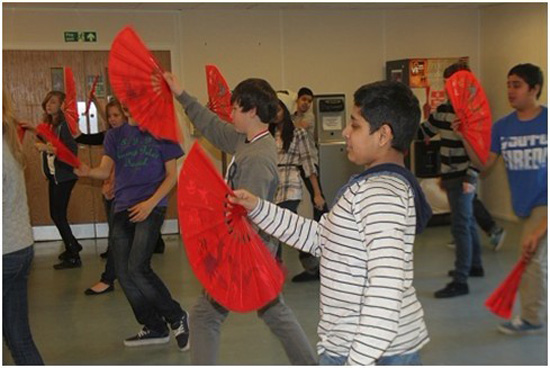 刘烊老师在学校体育馆里为大家展示了一套太极功夫扇,这套功夫扇是北京市体育协会为了支持北京申办奥运会的活动,大力开展人民的体育锻炼而创编的,它融合了太极拳,功夫,北京戏剧等元素。很多学生都表示了解中国,最先了解的是中国功夫,但是一直来都没有亲身体验过,所以个个都显得特别地兴奋。尤其是每当他们成功地展开了手中的扇子时,脸上的流露出的惊讶和喜悦,让寒冷冬天的体育馆里的温度不停地高涨。学生们表示要好好地学习太极功夫扇,这意味着将中国人民的健身热情传递到英国人民手中,就如同将奥运圣火将从中国传到英国一样。(撰稿人:英国英格兰学校联合会 Finham Park School孔子课堂)