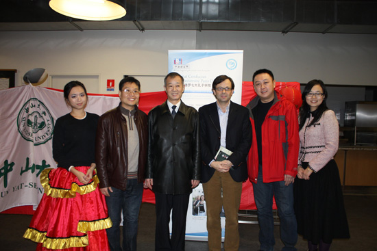 巴黎七大孔子学院中方院长钱治安教授、法方院长吉野教授与中山大学艺术团员欢庆“孔子学院大春晚”。
