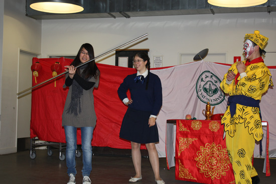 晚会开始,巴黎七大孔子学院中方院长钱治安教授和法方院长吉野教授一起走上台来,互道龙年祝福、共同展望美好未来。在融洽的气氛中,中大艺术团的姑娘小伙们给大家带来了优美的中国传统民乐合奏《春江花月夜》、《水调歌头》等经典曲目博来阵阵掌声;悠扬的民歌联唱《龙船调》《龙图腾》让法国观众耳目一新;最后艺术团还表演了国粹京剧《大闹天宫》,“孙悟空”的好“功夫”惹得法国姑娘们也争先恐后地上台来一显身手,晚会在京腔京韵声中达到了高潮,有了中山大学艺术团的助兴,巴黎七大孔子学院的春节晚会更加充满了浓郁的节日气氛。