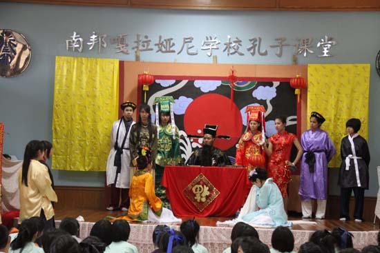 经过两个多月的准备,南邦嘎拉娅尼学校中文专业高三的学生以话剧的形式把中国的传统故事重新演绎。学生在熟悉剧本的基础上,还加上了自己的创意,使得演出精彩纷呈,中场休息还加上了中国舞、舞剑等小节目的点缀,使得观看的学生喝彩连连。《包青天断案之灰栏记》讲诉了两妯娌争子,包青天灰栏智断而亲情胜出的故事,学生收放自如的表演使故事被演绎得波澜起伏,台下的掌声此起彼伏。讲诉中国传统爱情故事的话剧《牛郎织女》也颇为精彩,这一话剧经过学生的创新改编,笑料不断,引得台下笑声连连。