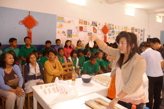 包饺子是中国春节一个传统习俗。1月19日,在塔那那利佛任教的6名汉语教师志愿者带着锅碗瓢盆、油盐酱醋及食材,在清泉中学举办了一次包饺子活动。志愿者们利用视频资料向该校一百多名师生展示了饺子的制作过程,并利用实物进行了演示。不少师生现场拜师学艺,气氛十分热烈。参加此次活动的师生在现场品尝了饺子,体验了中国饮食文化的魅力。活动结束,学生们演唱了歌曲《北京欢迎您》,表达了对汉语的热爱,对中华文化的欣赏。