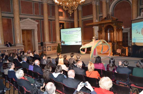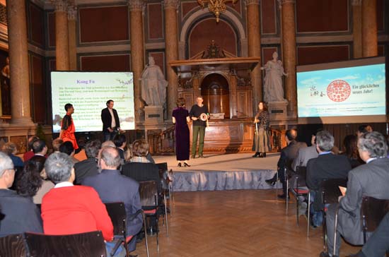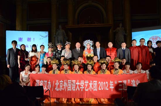 2012龙年伊始,北京外国语大学艺术团带着中国人民的新春祝福,来到多瑙河畔。1月31日晚,欧洲三国“迎春之旅”的首场演出在维也纳大学主楼礼堂里举行。这是中国国家汉办主办、维也纳大学孔子学院和北京外国语大学承办的 “孔子学院大春晚”巡演活动,中国驻奥地利大使史明德先生、北京外国语大学校务委员会副主席姜绪范教授出席并致词,社会各界名流及慕名而来的300多名观众欢聚一堂,共贺新春佳节。