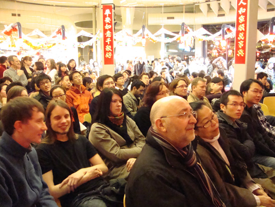 傍晚不到6点,大门口内外已站满来参加活动的人。走进大厅,人们手举着香槟酒杯,点头致意,随处都能听到“你好!”“新年好!” 的相互祝福,而且不少出自外国学生之口。孔子学院在入口处专门为参加活动的孩子们开辟了一个趣味游戏的中国乐园,两名公派志愿者热情接待前来游玩的大人和孩子。二楼的联欢晚会现场景致更是令人目不暇接,高挂的大红灯笼、随风飘逸彩气球、喜气洋洋的大“福”字、大柱上张贴的多幅春联以及围绕在食堂大厅上方整整一圈由多名中外学生共同创作的中国书法字画长卷如同一条漫舞的长龙为龙年带来了浓浓的中国年味。学校食堂特地为这次活动准备了饺子、春卷、宫保鸡丁、西湖牛肉羹等中国特色菜和青岛啤酒。很快饺子就已经售罄。来自各不同国家的欧亚学生在这次春节联欢会上与中国学生、华人华侨欢声笑语、举杯同乐。不少当地民众举家前来,还有座轮椅而来的残疾人和家庭。