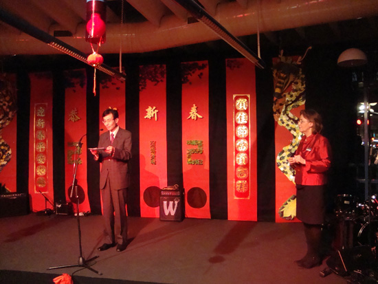 联欢晚会于晚上7点30分正式拉开帷幕。中国驻法兰克福总领馆教育领事刘小绿和副领事王林专程来到杜伊斯堡,在访问了鲁尔都市孔子学院后接着赶到晚会现场。刘领事在新年贺辞中风趣地举“吃肉”的实例来说明中国近30年来的快速发展和变化,简要介绍了中德关系的友好发展并向各界德国来宾和友人表示感谢,向中国留学生致以新年祝福。杜伊斯堡-埃森大学鲁尔都市孔子学院院长许宽华教授向大家介绍了中国春节的意义和龙年民俗。他认为“中国龙”是驱邪镇恶的吉祥物,是生命活力、超越自然力的象征,因而不应被简单地理解为西方的“dragon”。为此,他建议大家在说中国“龙”时只说“long”,不必用其他语言来表达,就象“功夫”一样。这些都使在场的各界朋友加大了对中国文化和中国人民的了解。