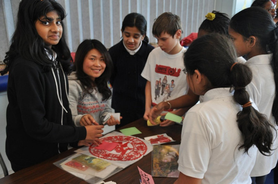 宋诗琴老师布置的特别富有中国味儿的展台吸引了很多师生的目光。和宋老师一起漂洋过海来到蒙特利尔的五星红旗,中国地图,北京名胜的明信片和年味十足的如意结,鱼结,把十足的红色情怀带到了Sinclair Laird。她还展示了包含着十二生肖图样的剪纸工艺,惟妙惟肖的生肖和汉字仅靠着一把小巧剪刀三五下的裁剪就跃然而出,惹得孩子们阵阵欢呼雀跃。