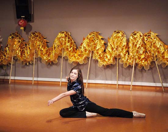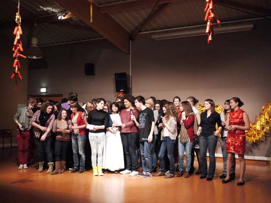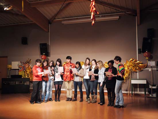 龙年春节,凯兰高中的中文教师杨蔓蕾、胡志敏和汉语助教辅导学习中文的学生准备了丰富多彩的节目:法国学生自编自导自演中文小品《中文太容易了》,取材于法国人学习法语的发音错误而闹笑话的故事。学生们还献上了诗朗诵“一去二三里”,标准的发音,抑扬顿挫的节奏给予人美的享受,其他节目例如相声、武术、钢琴表演、笛子表演、剑术、歌舞,都迎来阵阵掌声,大合唱“拜年歌”、“朋友”、“北京欢迎你”、“恭喜发财”等歌曲让大家久久地沉浸在节日的喜悦中。压轴的节目是孔子课堂的女生舞龙队,在舞台上舞动金龙,庆祝龙年的到来。
