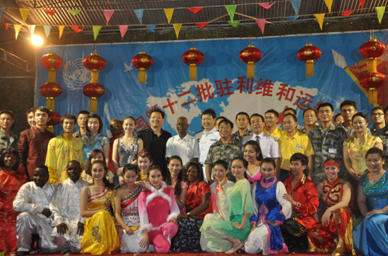 2月3日晚上,艺术团师生不辞劳苦来到中国驻利比里亚维和部队运输大队进行第三场专场演出,两百多名维和官兵及维和警察兴致勃勃地欣赏了精彩表演,维和官兵也把精心编排的节目加入了演出,气氛十分热烈,演出持续了近三个小时才在官兵们的掌声中和恋恋不舍中落幕,官兵们纷纷走上舞台与演员们拍照留念。演出之前,演员们还特地来到营地哨所为站岗士兵演唱,令士兵深受感动。