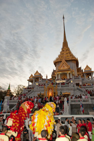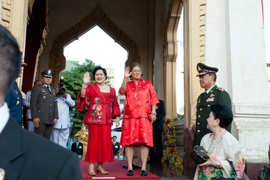 23日下午5时许(中国农历龙年大年初一),泰王国诗丽吉王后陛下和诗琳通公主殿下驾临泰国曼谷市唐人街岱密金佛寺,由此开启了泰国龙年春节庆祝活动的序幕。泰国岱密中学孔子课堂组织了盛大的欢迎仪式,现场摩肩接踵,场面一片热烈。11家在泰孔子学院和孔子课堂共同参加了此次觐见王后陛下和公主殿下的活动,并敬献了具有浓郁中国文化特色的礼物。御车经临时,王后陛下和公主殿下向中国老师们挥手致意。