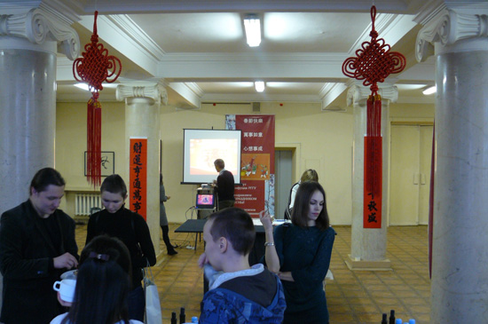 虽然春节已过,但是按着中国民间谚语“二月二龙抬头”标志春节结束的说法,大春节还在延续。2月17日在新学期开始之际,俄罗斯国立人文大学孔子学院在主楼大厅举办了一场别开生面的以“大春节——体验中国年”为主题的春节活动。孔子学院中外方院长、全体汉语老师、莫斯科当地汉语学习者、当地华人华侨100余人齐聚一堂,共庆龙年新春,共贺传统佳节。孔院的汉语老师们与学生一起动手,共同装点,使整个会场充满了喜庆祥和的佳节氛围,洋溢着浓郁的传统风情,随处可见的大红中国结,无一不传递着人们心中对于新春佳节到来的喜悦之情。孔院的俄罗斯学生有的身穿充满着中国风味的旗袍,有的身着唐装,贴春联、挂字画,在布置得年味儿十足的活动现场,俄罗斯各界及孔院师生真真切切地感受了一把中国年的味道。