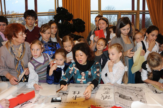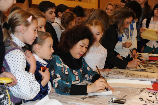 莫斯科第11、第548、第1599和第1535中学,均是人文大学孔子学院的合作伙伴。为了提高俄罗斯中小学生对汉语及中国文化的学习兴趣,俄罗斯人文大学孔子学院经常为这些学校举办中国文化周活动。在大春节活动现场,孔子学院中方院长韩立华为同学们展示了中国书法,并按照同学们的请求书写了表达美好愿望的作品送给大家。在韩老师的带领下,同学们纷纷动手,裁纸、研磨、挥毫,体验中国传统文化,简单的画案霎时变得极富感染力,充满了文化气息。