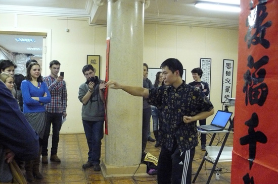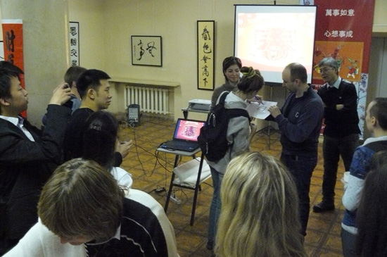 孔子学院俄方院长易福成介绍了中国春节的风俗习惯、历史渊源、民间传说、庆祝方式等,配合精心准备的幻灯片,添笔画-变汉字、闹元宵-猜字谜,既考验了大家的智慧,同时又向众师生展示了中国汉字的魅力。