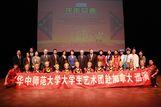 当地时间2012年2月9日晚,魁北克交响音乐厅座无虚席,观众们在期待中迎来了由华中师范大学大学生艺术团带来的一场视听盛宴。中国驻蒙特利尔总领事赵江平、魁北克大学校长Claude Corbo、华中师范大学副校长黄晓玫出席了此次活动,当地华人华侨以及蒙特利尔魁北克大学孔子学院师生等近千人观看了演出。