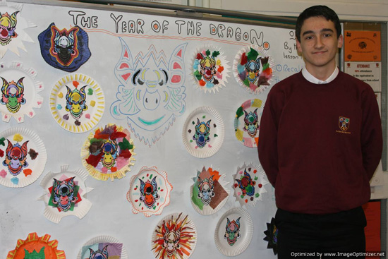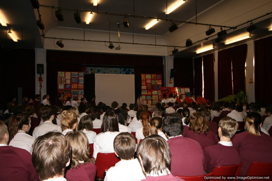 1月23日,大年初一,星期一早上九点,SSAT孔子课堂Grangefield School开始了庆祝中国新年的活动。这天早上,学校里异常欢乐热闹。大厅里一张张色彩缤纷,活灵活现的龙映入了我们的眼帘;在这些画的旁边摆放着一个个手工灯笼,有的是船,有的是房子,有的是飞龙;楼道上则摆满了泥塑的小兵马俑。大厅的舞台上,一个个精彩的表演正在轮番上演:十一年级的学生受到中国皮影玩偶的启发,正在使用自己制作的道具表演'年'的故事和盘古开天的神话传说;八年级的学生组成了一个乐团,表演着中国音乐;九、十年级的学生则表演了中国的太极扇舞蹈。他们精彩的演出赢得了轮流前来观看表演的各个年级学生的热烈掌声。