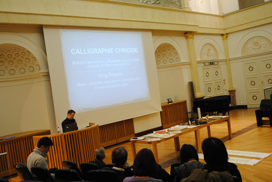经过前两场的活动,列日的书法爱好者已经被曾先生的艺术水准深深折服,听众对于中国书法艺术价值的学术讲座兴趣渐浓。本日19点整,在列日大学总部最大的会议厅“学院厅”,列日孔子学院继续邀请曾炳炎先生讲解书法艺术。