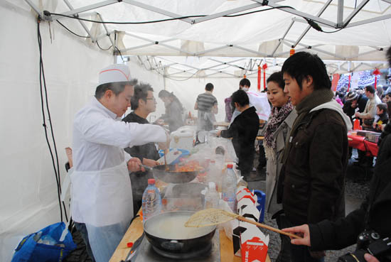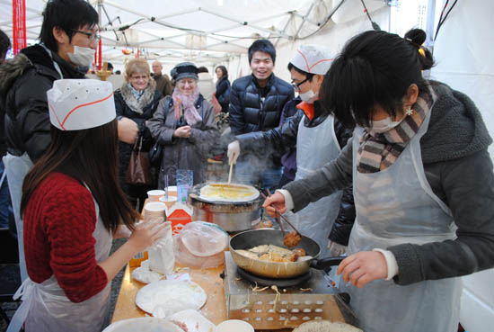 经过大红灯笼、中国结、中国剪纸艺术等特别的装饰,雷恩市政厅广场前的“中华美食街”洋溢着浓浓的中国气息。来自祖国各地的近百名留学生、志愿者,以及孔子学院的院长和老师们,亲手将家乡的特色小吃原汁原味地展现给在法国市民面前。值得一提的是,法国朋友、台湾同胞也加入到了孔院的志愿者队伍,与大家同心同德、通力协作。美食街共设置了十二个摊位,水饺、馄饨、蒸包、煎饼果子、炒面、烤肉串、茶叶蛋、土豆饼、凉拌菜等中国各地的特色小吃,琳琅满目,令人应接不暇。主厨、帮厨分工明确,所有小吃全部现场烹饪,让法国朋友对他们不太熟悉的煎、炒、蒸、煮、炸的中式做法以及中国饮食颇为讲究的色、香、味饶有兴趣,每个摊位前都吸引了大批市民,排起了长长的品尝队伍。