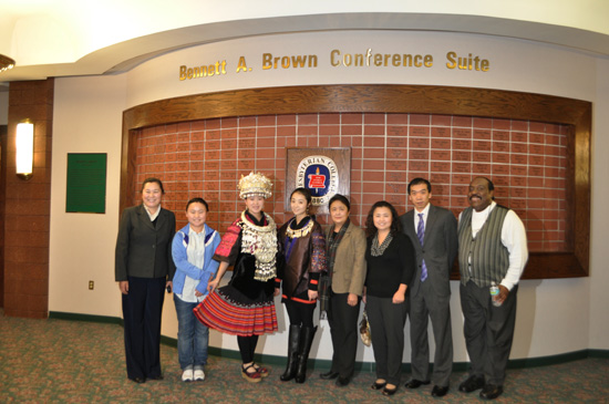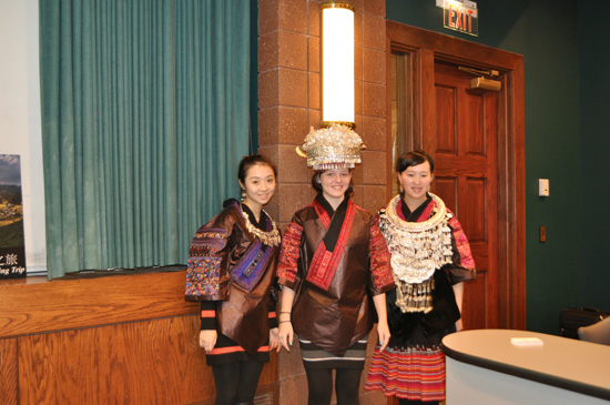 1月25日下午3点,前贵州省旅游局局长杨胜明博士、贵州师范大学国际旅游文化学院院长张晓松博士为普莱斯比学院的师生们做 了一场题为《贵州山地少数民族》的专题讲座,吸引了许多美国师生前来听讲。讲座从贵州地理地貌、历史沿袭、苗侗等少数民族的风俗习惯等方面,多层次多角度地向美国师生介绍了贵州省的情况和丰富的少数民族文化。讲座过程中,师生们还对同时展示的“贵州古法造纸”、苗族服饰等产生了极大的兴趣,两位贵州少数民族姑娘还帮一位美国女学生穿戴上苗族服饰,现场观众都用掌声表示了自己对这些民族文化的喜爱。讲座后,听讲的美国教授和学生们还纷纷提问,与张博士进行积极地交流。