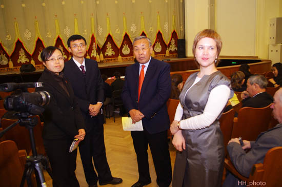 演出前布里亚特国立大学校长卡尔梅果夫与《巡演团》团长孙丽娜交谈