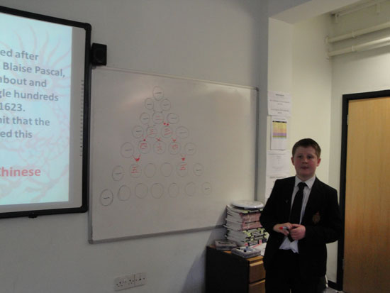 值得一提的是音乐课和数学课。在音乐课上,学生们欣赏了中国传统音乐《春节序曲》和京剧《咏梅》,了解了简谱,学唱了《春节序曲》的主旋律和歌曲《新年好》。孩子们专注的眼神和投入的演出告诉我们,音乐是无国界的。在数学课上,学生们了解了圆周率、勾股定理、杨辉三角等,知道了祖冲之、商高、杨辉等中国古代数学家和《周髀算经》《九章算术》等中国古代数学著作,还学习了中国数字。当老师用最直观的方式证明勾股定理的时候,孩子们的脸上写满了惊奇,当他们自己完成了杨辉三角的乘方图时,满脸是获得成功后的幸福,当他们因为一个数学游戏而绞尽脑汁时,他们的思维得到了训练。