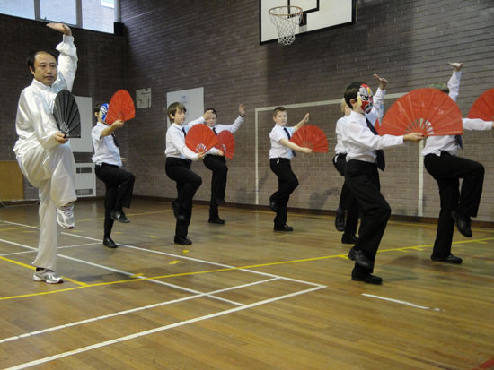 2012年1月23日,中国壬辰龙年正月初一。在英国国王中学学生集会上,由汉办教师李双义和他的学生表演的太极功夫扇和歌曲《新年好》拉开了国王中学中国春节文化介绍和新一轮国际汉语教育的序幕。