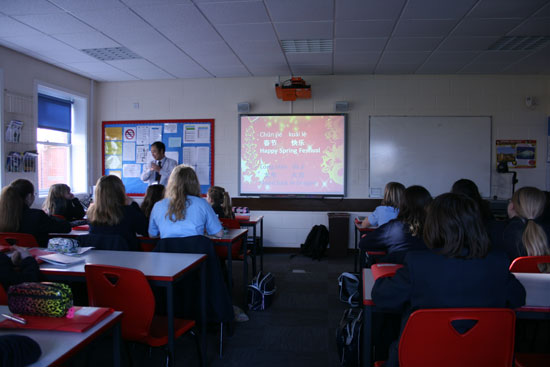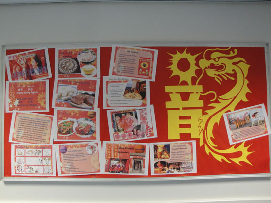 为了迎接中国春节的到来,国王中学语言部负责人Mrs. Martin、孔子课堂负责人Mr. Haslam和汉办教师李双义周密安排、精心准备。孔子课堂和Mr. Haslam的教室门口贴上的李双义老师创作书写的春联,孔子课堂的宣传栏里也布置一新,中国龙的剪纸和介绍春节的图片、文本等传递着龙年春节的消息,置身其中,让人感受到浓浓的中国年味。China Club的学生们每天准时到孔子课堂,练习太极功夫扇和歌曲《新年好》。
