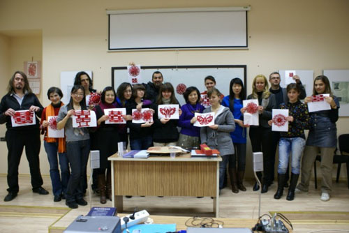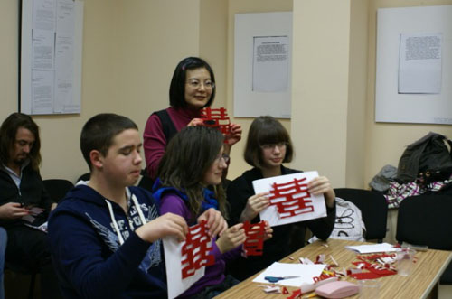 这次活动播放了介绍中国剪纸艺术的短片,安排了小型剪纸作品展,索非亚孔子学院中方院长田建军副教授为大家做了简短的讲座,之后,汉语教师季青和志愿者曹继阳、杨艳艳、李娜分别教大家学习“双喜”、“雪花”和“蝴蝶”等的剪法。
