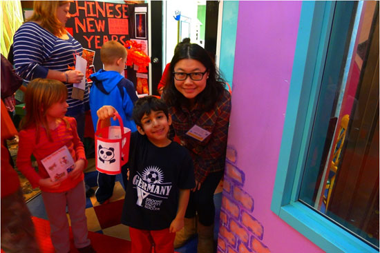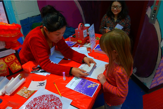 中国灯笼制作的桌前围满了小朋友,他们都在跃跃欲试,希望可以亲手制作一个龙年大红灯笼。在志愿者的指导和帮助下,孩子们用笔在宣纸上一笔一笔认真的画着熊猫、小兔子、龙、鞭炮等有中国特色的图案,然后将它们贴在已经有灯笼雏形了的长方形卡片的一个面上;志愿者又手把手的教孩子们在卡片的另外两边,用剪刀剪出心、五角星等图案,最后将卡片两边黏在一起,红灯笼就做好了。孩子们拎着自己做的红灯笼,这儿摆摆、那儿挂挂,开心极了。每个孩子都在动手制作的过程中获得了极大的乐趣和成就感。