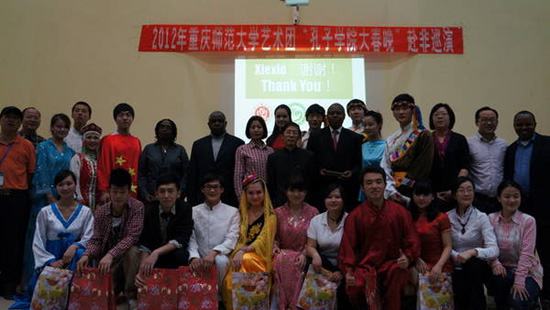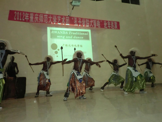 据悉,由18名学生和6名老师组成的重庆师范大学艺术团自16日起先后在赞比亚和卢旺达举行了9场文艺演出和多场文化实物展览,通过对中国元素原汁原味的展示,传播了中国语言与文化,受到当地民众欢迎。