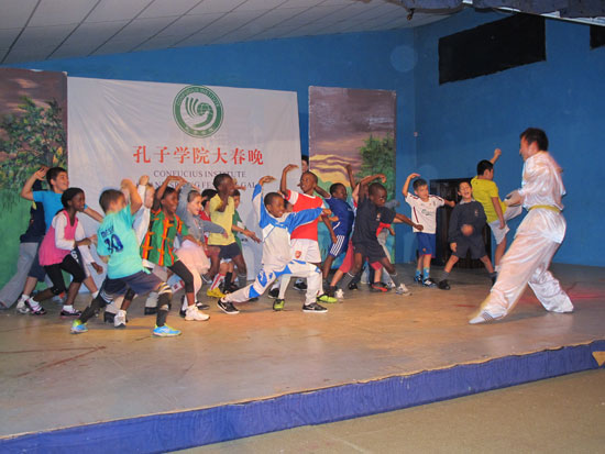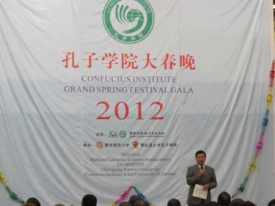 2月16日至22日,由孔子学院总部主办, 重庆师范大学和赞比亚大学孔子学院承办的 “孔子学院大春晚”艺术团来到赞比亚,先后在中国驻赞比亚大使馆、赞比亚大学体育馆、赞比亚宝宝学院、西北铜带省中色卢安夏铜业有限公司和南方省利文斯顿利比斯学院进行了六场精彩演出,在当地社会引起了强烈的反响,掀起了新一轮汉语学习的浪潮。