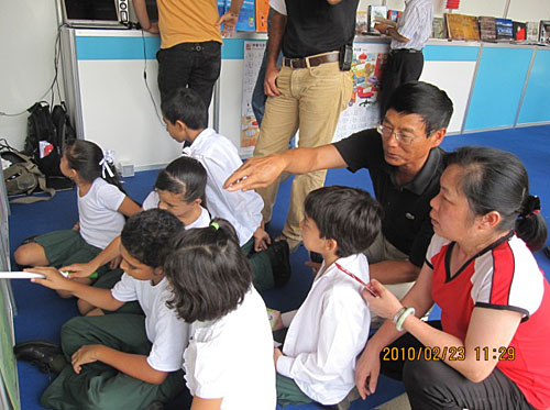 中午,一批批中小学生来到展台,他们翻阅着精美的汉语教材和画册,为画册上生动的故事吸引,我们的工作人员向他们介绍书中内容,引起阵阵欢笑。许多小朋友席地而坐,拿起有声识字教鞭在工作人员的指导下学习中国民歌“茉莉花”。他们还拿起教鞭读汉语,在场的工作人员为他们纠正发音,孩子们都极其认真地跟着学。许多学生表现出对学习汉语的强烈愿望。许多本土教师看到国家汉办编写出版的多种翻译成西班牙语的汉语教材和先进的教学工具,都非常感兴趣,纷纷询问怎样才能买到。