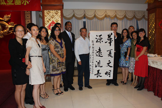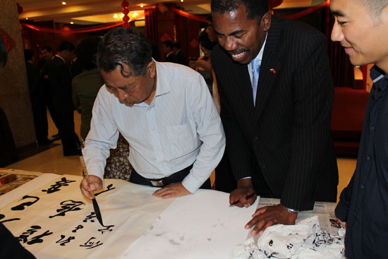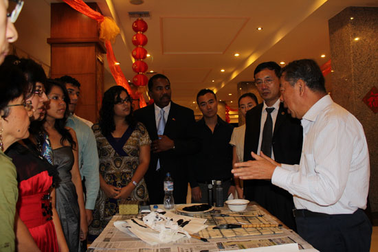 代表团成员、中国著名书法家邵秉仁先生与孔子学院的师生进行了文化互动。邵先生全部使用汉语与师生进行了交流。他就中国文化在世界范围内的传播、孔子儒学与中国文化、汉字承载的文化因素、书法艺术之于汉字等当地学生关注的话题,与孔子学院的师生进行了互动。他的讲述深入浅出,娓娓道来,为孔子学院的师生,特别是当地的学生提供一次难得的、感受中国文化的机会。