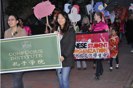 游行的队首由威大法学院的学生手举孔院和中国文化学生会的标志