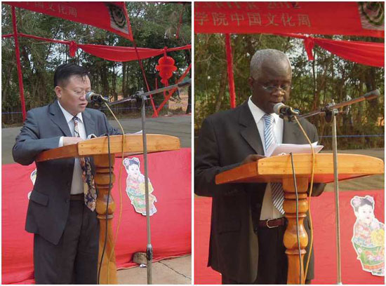中国驻多哥大使馆参赞霍天云和洛美大学副校长葛菲•阿帕加纳(Koffi AKPAGANA)教授在文化周开幕式上致辞