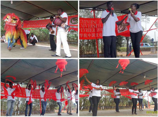 开幕式上,孔子学院的学生们为大家表演了《狮舞贺新春》、歌舞《青春舞曲》、红绸舞《越来越好》、情歌对唱《康定情歌》、《月亮代表我的心》和大合唱《祝福你,中国和多哥》、《我和你》等精彩节目,赢得了观众热烈的掌声和喝彩。威武喜庆的狮舞在非洲鼓乐声中舞出了中国的热闹吉祥、非洲的热情奔放。红绸在学生们的手中舞动着中国的风采和非洲的韵味。同学们唱着《青春舞曲》,跳着多哥传统舞,中多不同的文化元素在演出中交流融合,碰撞出让人惊叹的别样精彩。观众从这些精彩的表演中欣赏着两国不同的文化的魅力,感受着同样的欢庆和快乐,共同对新的一年许下美好的愿望和祝福。