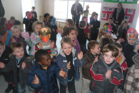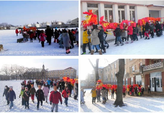 受法国当地气候的影响,为宣传中国新年文化而准备的庆祝活动推迟到二月下旬举行,但是糟糕的天气丝毫没有影响学校老师和学生们对活动的热情。本次活动规模盛大,小学部全体师生共同参与,影响剧烈,大大增加了孩子们对中国文化的了解和热情。整场活动持续近三个多小时,分六部分:中国新年传统介绍,接力游戏,观看皮影戏,舞龙及庆祝游行,放鞭炮,下午点心及发红包。