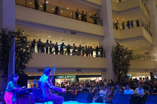 香格里拉商场内挤满人群,现场200个座位全部坐满,整个大厅内四层楼走道内到处围满观众,观看整场演出的观众多达500人,还有一些流动人群也观看了部分演出。大家时而凝神观看,时而为演员们精湛的表演拍手叫好。