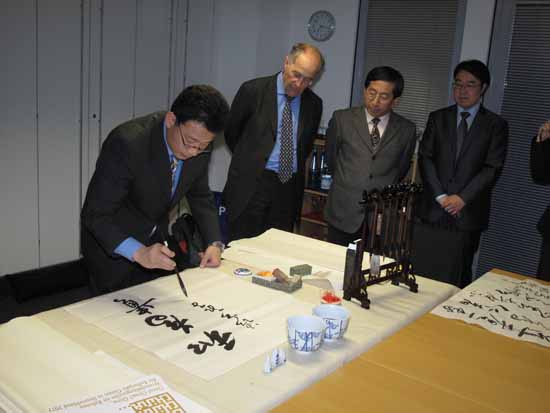 慕尼黑东方基金会会主席柏拉特教授聘请王顺卿总领事担任慕尼黑孔子课堂顾问,并颁发了聘书。王总领事当场挥毫,书写了《论语》中的“和为贵”和“智者不惑,仁者不忧,勇者不惧”两幅字,赠送给慕尼黑孔子课堂。