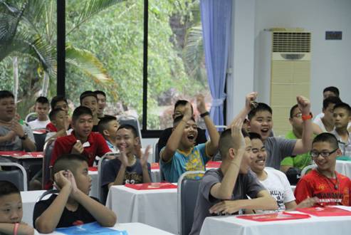 在“中文故事领悟”活动中,由中国老师用汉语讲授《鹿乳奉亲》的故事,并由泰国本土汉语教师进行简略翻译,然后让学生们根据听到的汉语和自己的领悟画出故事的画面。在“中国文化才艺展示”活动中,学生充分发挥各自优势和特点进行了才艺展示,节目形式纷呈有趣,尤其诗歌朗诵兼表演《静夜思》、歌曲串烧《朋友》、短剧《龟兔赛跑》等节目将活动多次推向高潮。在“泳池大战”活动中既锻炼了学生的团队合作精神也提升了汉语运用应变能力,让各组学生一半下游泳池,一半在岸上,老师将包有中文字的纸条放进彩蛋壳并扔入泳池,由水中队员通过比赛赢得彩蛋并迅速送给岸上队友拿到老师身边用汉语读给老师听,用时最少并朗读正确的组为获胜者。