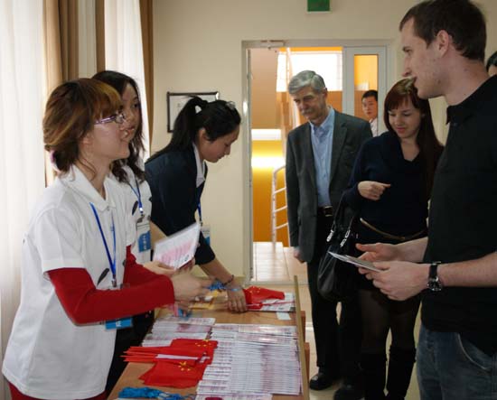 新西伯利亚国立技术大学孔子学院志愿者在为观众热情服务