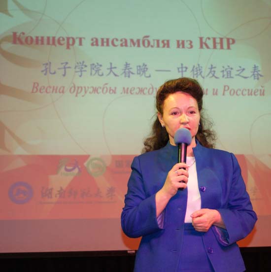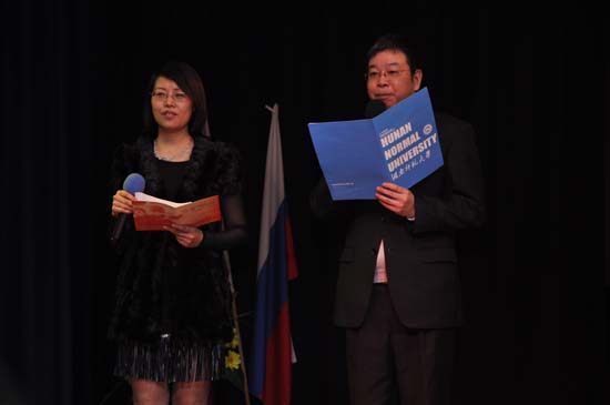 新西伯利亚州外事处副厅长Н. Ю朱可娃女士,市外事厅厅长С.В萨尼科夫先生、新西伯利亚国立技术大学第一副校长Г. И拉斯达古耶夫先生、湖南师范大学副校长暨巡演团团长周俊武先生、新西伯利亚国立技术大学孔子学院院长牟先明先生出席了本次晚会并分别致欢迎词,表达了对中俄友谊天长地久的美好祝愿。同时出席本次晚会的还有新西伯利亚国立技术大学外事校长Е. Б崔先生、新西伯利亚国立技术大学孔子学院中方院长王婵娟女士、孔子学院师生、新西伯利亚市各高校、中学汉语教师和学生、中资机构代表、华人华侨、在俄留学生等社会各界人士600多人观看演出。
