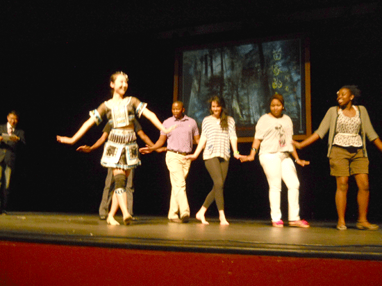 潘雪柯同学在表演了《苗家的女儿》后和观众互动,好几位观众主动上台,学习她的舞蹈动作