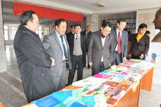奥什工业大学校长阿比多夫•阿卜杜卡迪尔•乌玛诺维奇教授(ABITOV ABDUKADYR UMAROVICH)(左二)陪同中国驻吉尔吉斯斯坦政务参赞邓浩博士(中)参观汉办教材图书展
