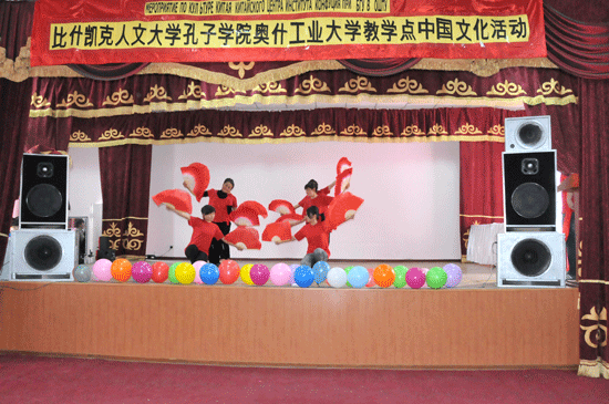 在奥什工业大学演出大厅,比什凯克人文大学孔子学院院长苏白还专门与奥什工业大学学生举行了一个生动有趣的座谈会及简短且意义深重的汉办教材赠书仪式,苏白院长勉励大家努力学习汉语。随后,奥什工业大学汉语教学点的学生为来宾们奉献了一场自编自演的文艺演出。小合唱、绕口令、中国功夫、诗朗诵、扇子舞博得了观众们的阵阵掌声。此次活动,奥什电视台、报社等多家媒体对此进行报道。