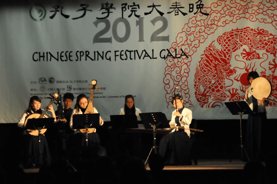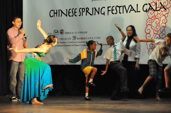 本次“孔子学院大春晚”巡演团20名演员来自中国人民大学学生艺术团,该组织是国内最早登上国家大剧院的高校青年业余艺术团。当晚的演出 中,他们将中国民族音乐和舞蹈的独特魅力发挥得淋漓尽致。民乐合奏《花好月圆》以深厚的音色生动表现了人们在月下花丛尽情欢舞的场面;打击独奏《风如松》以激昂的鼓点向观众展示了中国人乐观昂扬的品质,让习惯了非洲鼓乐的观众耳目一新;著名的《赛马》曲仿佛给人一种置身草原狂奔的感觉;舞蹈《苗家的女儿》、《孔雀飞来》、《牛背摇篮》则分别展示了神州大地不同区域浓郁的民族风情,优美的舞姿让现场的观众如痴如醉。主持人还在节目中穿插了用汉语说出乐器名称、模仿舞蹈动作等互动环节,观众踊跃参与,为演出增添了几多欢快。最后,演出在《喜洋洋》欢快轻松的旋律中拉下帷幕。